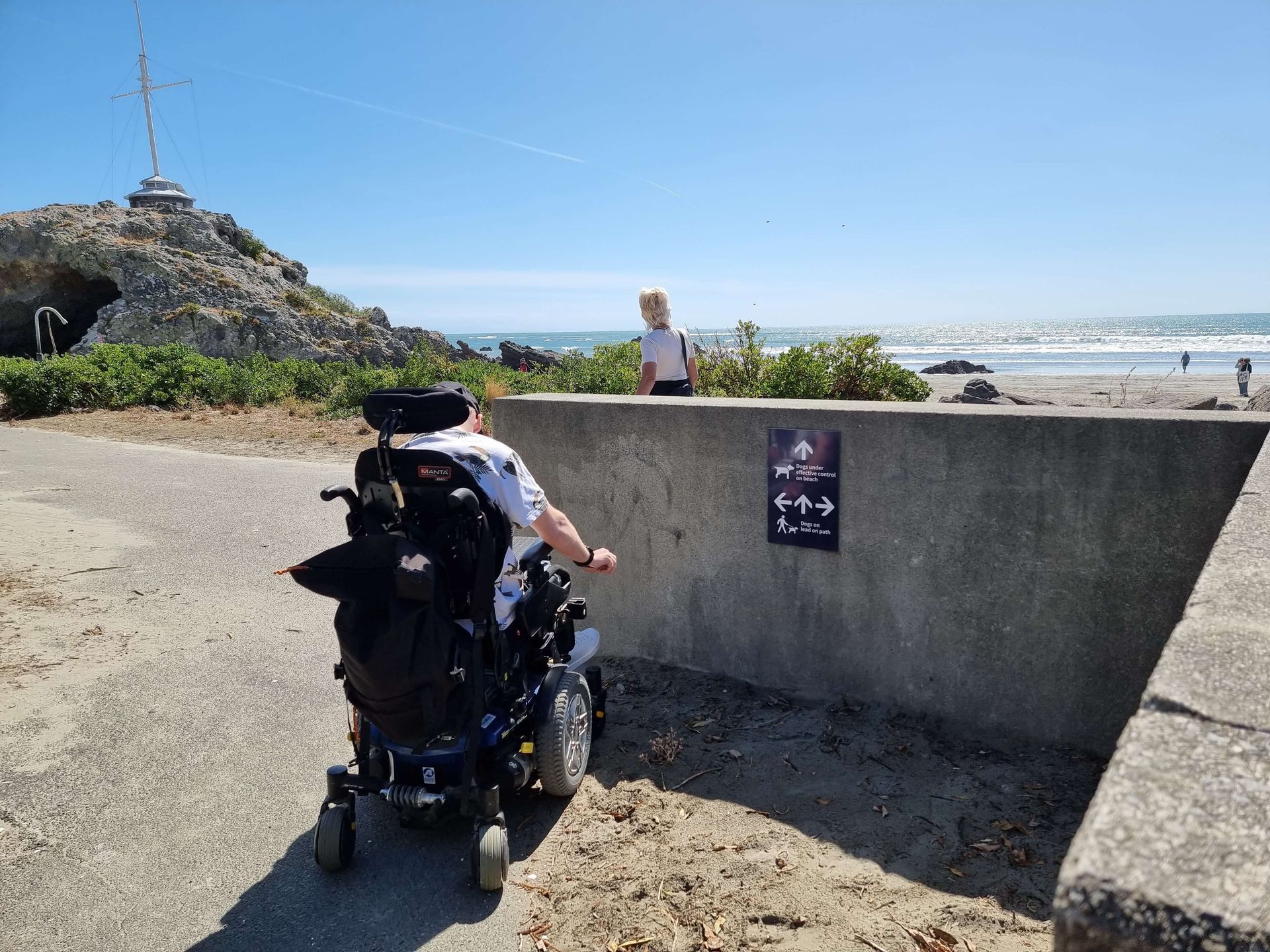 There is a wheelchair accessible concrete boulevard/promenade beside the beach from Cave Rock to Scarborough. It takes about 20 minutes each way. There are cafes at both ends of the walk in Scarborough and Sumner (Cave Rock). There are not many wheelchair parks at the Sumner End. It may be easier to park at the Scraborough end. The whole area is very busy in warm days, particulary weekends.