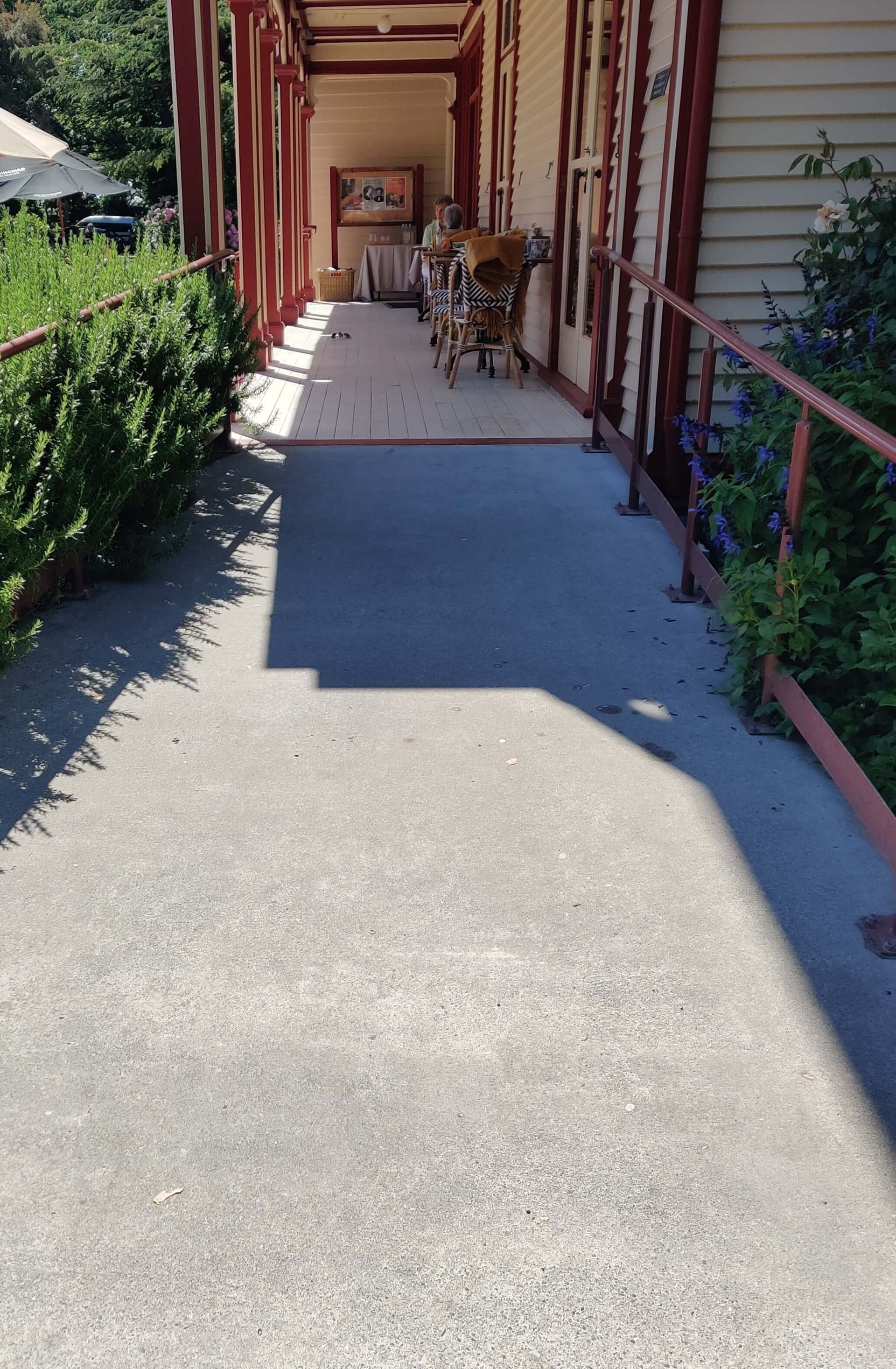 This cafe has good wheelchair access. I went to the cafe, not the restaurant and sat outside on the deck. It is flat from the carpark to the cafe, and has a ramp up to the verandah and main door. The main door has flat entry. There is also a large disability enabled toilet. There are many tables outside with a lot of room around them.